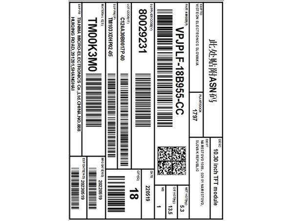 | | Supplier Information | | Supplier Name : | TIANMA MICRO-ELECTRONICS (HONG KONG) LIMITED | | Supplier Location : | | | Supplier Code : | 80029231 | | Incoterm : | DAP | | Shipping Unit Load Data | | Palletization Method : | Wood (Treated) | | Load Securement Method : | Stretch Wrap | | Unit Load Length : | 1,199.998 mm | | Unit Load Width : | 999.998 mm | | Unit Load Height : | 1,050.011 mm | | Pallet Height : | 3,810.000 mm | | Containers Per Layer : | 5 | | Layers Per Unit Load : | 4 | | Containers Per Unit Load : | 20 | | Unit Load Density : | 360 | | Unit Load Gross Weight : | 181.857 kg | | Tare Weight : | 81.866 kg | | Stackability During Transport : | 2 High | | Raw Material in Octabin : | No | | Transportation Mode : | Air | | | Suplier Notes | | | | Customer (or Receiving Location) Notes | | | | Master Label Sample Photo | Inner Label Sample Photo | | |  |  | | |